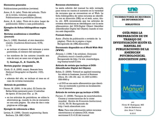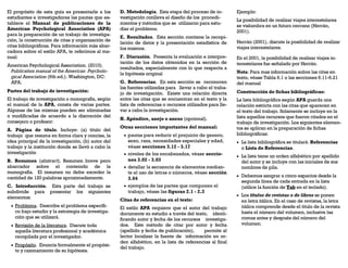 Este documento proporciona instrucciones sobre cómo citar y referenciar fuentes de acuerdo con el estilo de publicación APA. Explica cómo citar artículos de revistas, libros, periódicos y recursos electrónicos en el texto, y también cómo crear referencias bibliográficas completas para estas fuentes en la sección de referencias al final. Además, resume brevemente las partes principales de un trabajo de investigación según el estilo APA.