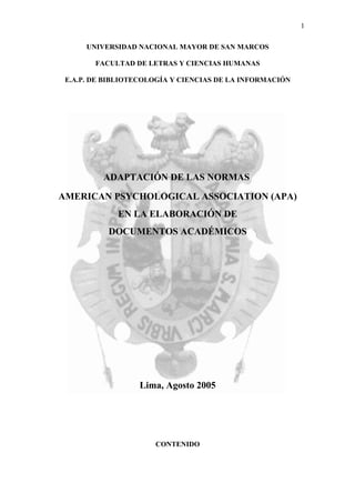 El documento presenta las normas de la Asociación Americana de Psicología (APA) para la elaboración de referencias bibliográficas y citas en documentos académicos. Incluye ejemplos detallados de diferentes tipos de referencias como libros, publicaciones periódicas, recursos electrónicos y audiovisuales, así como citas textuales y contextuales. Además, explica brevemente los objetivos y origen de las normas APA y la importancia ética de realizar citas y referencias correctamente en la investigación científica.