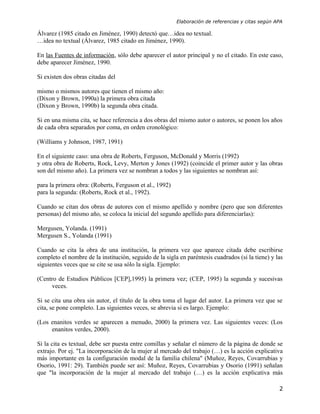 Este documento describe las normas de la American Psychological Association (APA) para la elaboración de referencias y citas. Explica cómo citar ideas de otros autores de manera textual o no textual, cómo citar obras con más de un autor, y cómo diferenciar obras del mismo autor publicadas en el mismo año. También cubre cómo citar referencias de obras, artículos, comunicaciones personales y notas al pie de página.