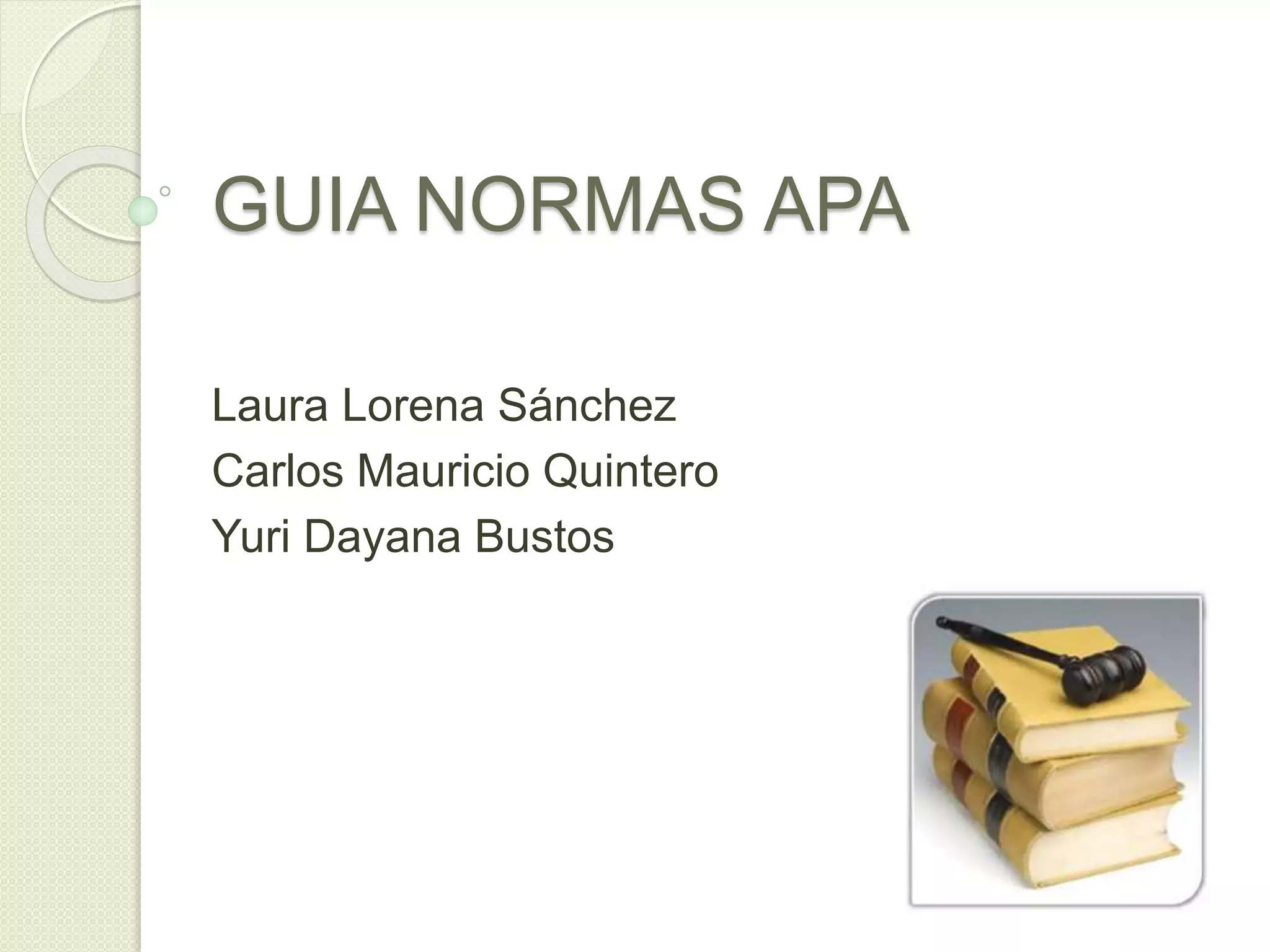 Este documento presenta una guía sobre las normas APA. Explica que las normas APA son las normas internacionales para la presentación de documentos y que Colombia está adoptando estas normas. Describe características como el tipo de letra Times New Roman o Arial tamaño 12, interlineado doble o 1.5, y márgenes de 2.54 cm. Incluye ejemplos de portadas, formatos y citaciones siguiendo las normas APA.