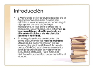 Este documento proporciona una guía sobre cómo citar y referenciar fuentes impresas de acuerdo con el estilo APA (5ta edición). Explica cómo realizar citas cortas y largas dentro del texto, el formato general de un trabajo, y cómo estructurar las referencias bibliográficas al final del documento de acuerdo con el tipo de fuente (libros, capítulos de libros, publicaciones periódicas, tesis, informes, recursos electrónicos).