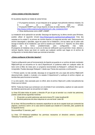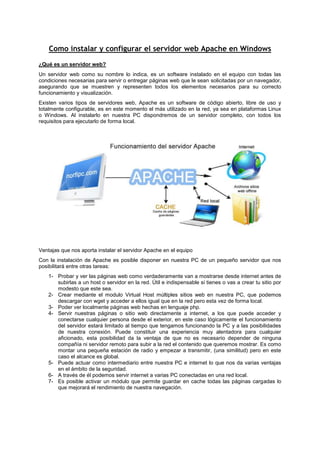 Este documento explica cómo instalar y configurar el servidor web Apache en Windows. Describe Apache como software de código abierto y el más utilizado para servir páginas web. Explica cómo descargar e instalar Apache, editar el archivo de configuración httpd.conf para configurar el puerto, la carpeta de documentos y permisos. También cubre cómo acceder al servidor localmente y desde la red, configurarlo como proxy y guardar páginas en caché.