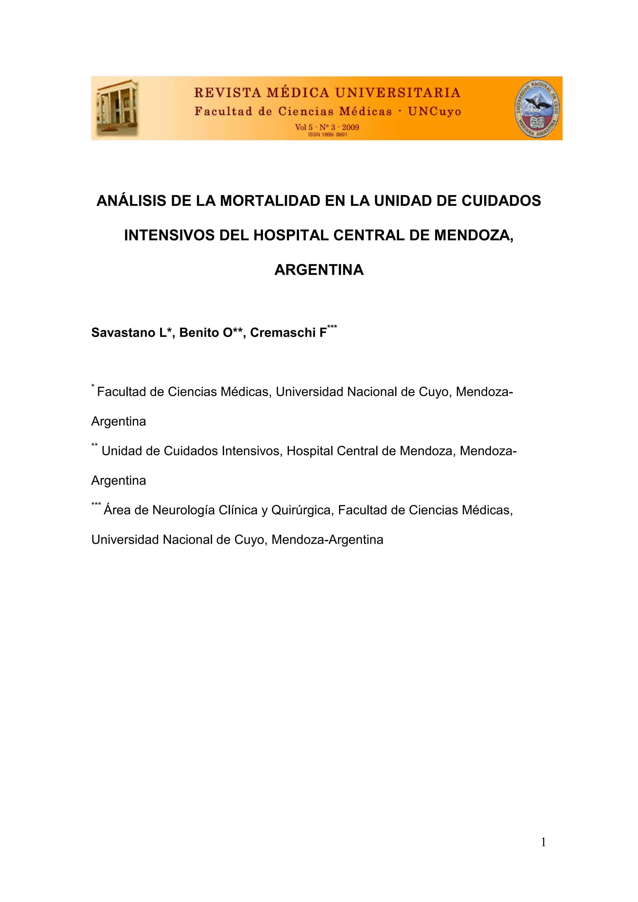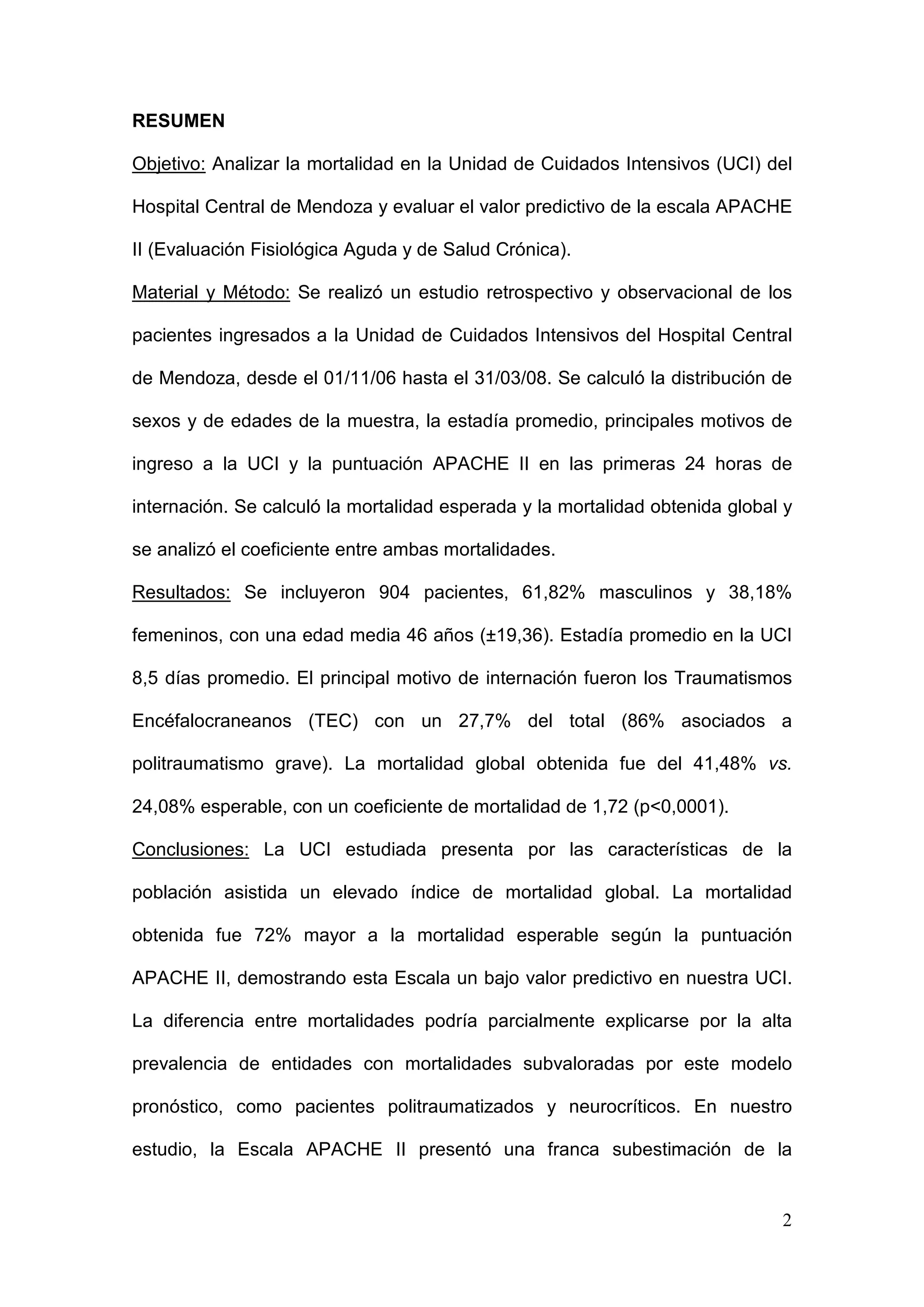 Este estudio analizó la mortalidad en la Unidad de Cuidados Intensivos del Hospital Central de Mendoza entre 2006 y 2008. Se incluyeron 904 pacientes con una edad promedio de 46 años. La mortalidad global fue del 41.48%, mayor al 24.08% predicho por la escala APACHE II. La escala subestimó la mortalidad de pacientes politraumatizados y neurocríticos. El estudio sugiere desarrollar un modelo pronóstico local y evaluar alternativas a APACHE II para predecir mejor la mortalidad en esta unidad.