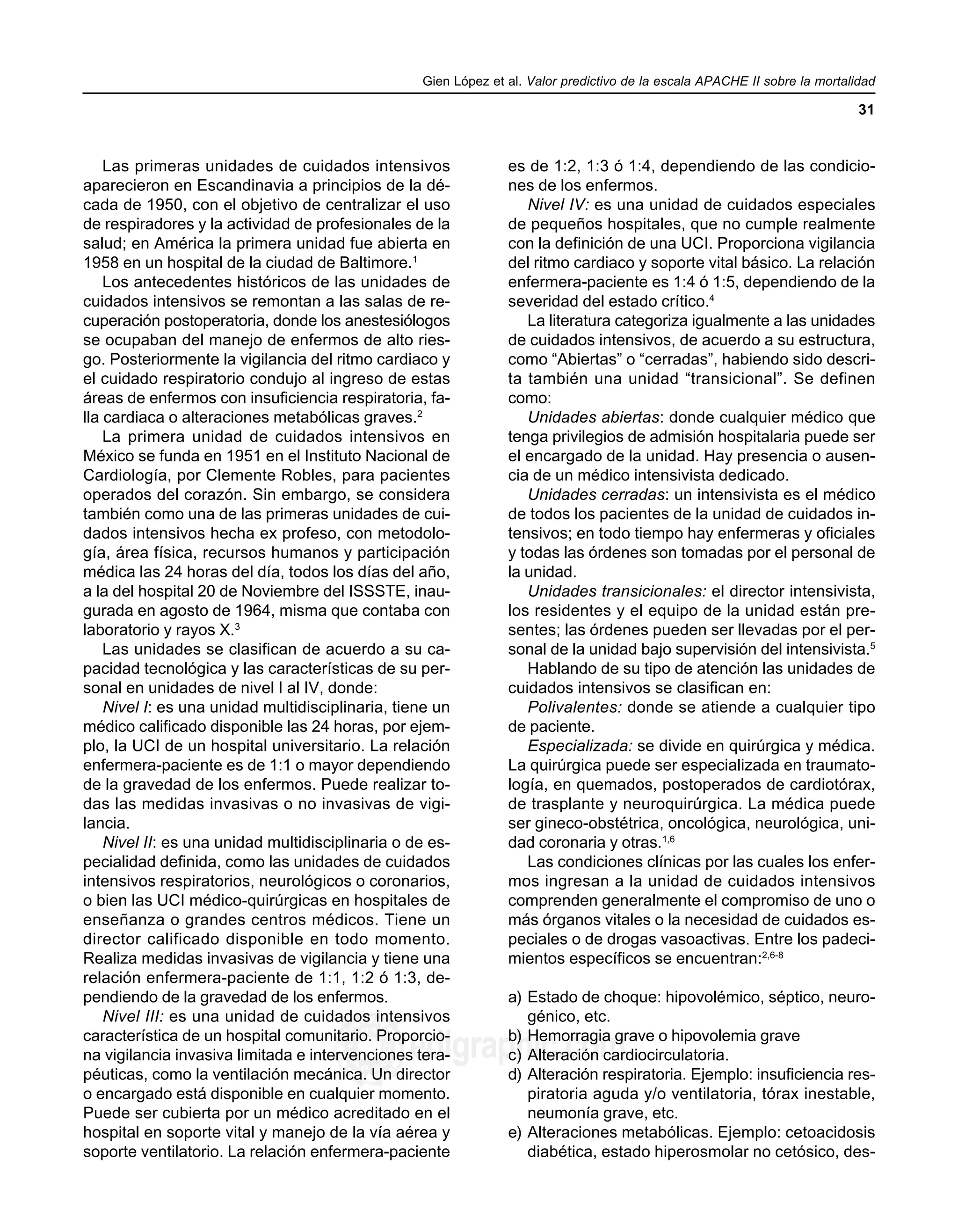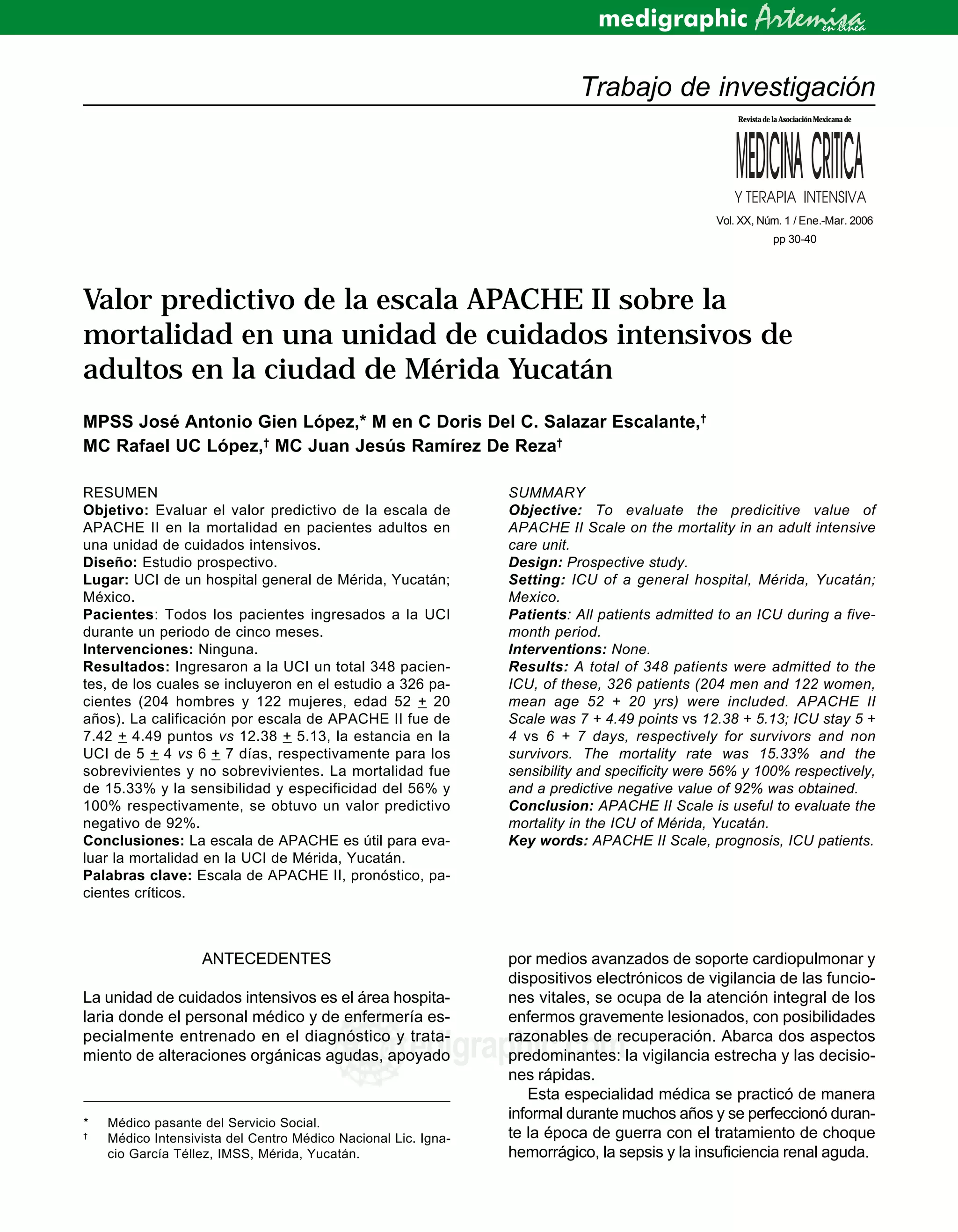 Este documento describe un estudio prospectivo realizado en una unidad de cuidados intensivos de un hospital general en Mérida, Yucatán, México. El objetivo del estudio fue evaluar el valor predictivo de la escala APACHE II sobre la mortalidad en pacientes adultos ingresados a la unidad de cuidados intensivos. Se incluyeron en el estudio 326 pacientes admitidos durante un período de cinco meses. Los resultados mostraron que la escala APACHE II tuvo una sensibilidad del 56% y especificidad del 100% para predecir la mortalidad, la cual fue de 15