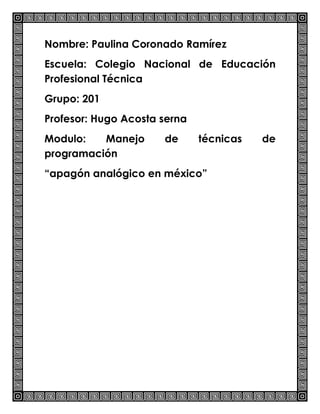 El documento habla sobre el "apagón analógico" en México, que es cuando se terminarán las transmisiones analógicas de televisión y se pasará completamente a la televisión digital terrestre. El presidente Felipe Calderón estableció el 31 de diciembre de 2015 como fecha límite para completar la transición. La transición beneficiará a México con mejor calidad de sonido e imagen y más canales disponibles, pero algunas personas tendrán que comprar convertidores para ver la televisión digital.
