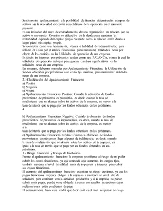 El documento habla sobre el concepto de apalancamiento y sus diferentes tipos. Explica que el apalancamiento significa lograr mayores resultados con menor esfuerzo gracias al uso de herramientas financieras. Describe el apalancamiento operacional como el uso de maquinaria para reemplazar mano de obra y reducir costos variables, aunque aumenta costos fijos. También explica el apalancamiento financiero como el uso de deuda para financiar activos y así aumentar la rentabilidad de los capitales propios.