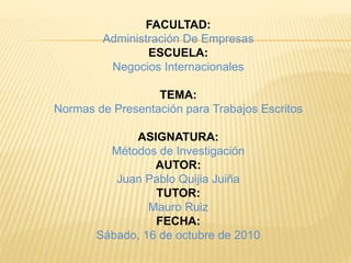 Este documento proporciona instrucciones detalladas sobre las normas de presentación para trabajos escritos según el estilo APA, incluyendo información sobre formato, tipografía, citas, referencias, tablas, figuras y más. El objetivo es proveer pautas claras para la comunicación efectiva en eventos académicos y publicaciones escritas de acuerdo con un marco cultural internacional.