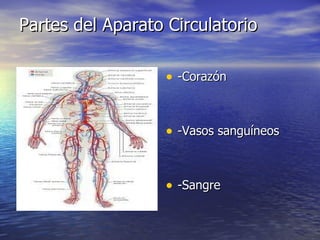 El documento describe el sistema circulatorio, incluyendo el corazón, la sangre y los vasos sanguíneos. El corazón bombea la sangre por todo el cuerpo a través de las arterias, venas y capilares. La sangre transporta oxígeno y nutrientes a los tejidos y órganos a través de la circulación sistémica, y recoge dióxido de carbono a través de la circulación pulmonar.