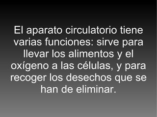 El documento describe el sistema circulatorio humano. Explica que transporta alimentos, oxígeno y desechos a través de la sangre, el corazón y los vasos sanguíneos. Describe que la sangre circula a través de dos circuitos, el mayor y el pulmonar. Explica que el corazón bombea la sangre a través de las arterias a los capilares y luego a las venas para volver al corazón. También cubre brevemente el sistema linfático.