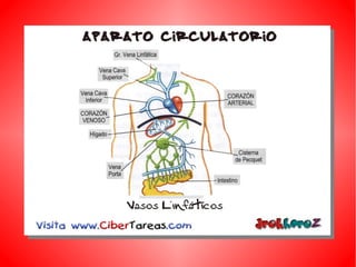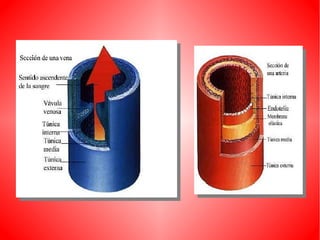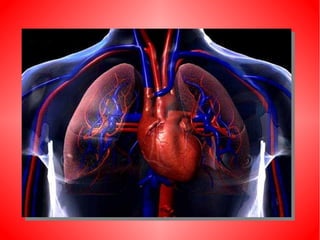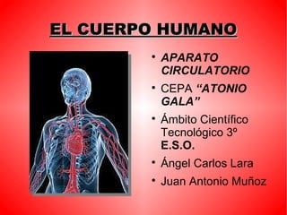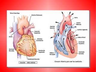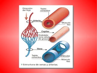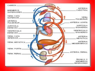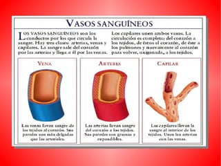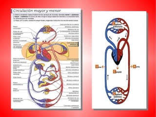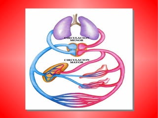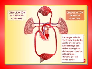 El documento describe el sistema circulatorio humano. Explica que la sangre circula a través del corazón, las arterias, las venas y los capilares, transportando oxígeno y nutrientes a las células y desechos lejos de ellas. Describe la circulación mayor, que transporta la sangre del corazón al resto del cuerpo, y la circulación menor, que transporta la sangre de los pulmones al corazón. También describe las partes y funciones del corazón, los tipos de vasos sanguíneos, y otros aspectos clave del