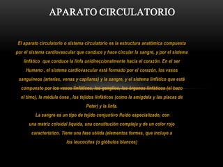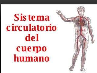 El documento describe el sistema circulatorio humano, incluyendo el corazón, las arterias, los capilares, las venas, la sangre y la linfa. Explica que la sangre circula a través del corazón y los vasos sanguíneos, transportando oxígeno y nutrientes a los tejidos y desechos lejos de los tejidos. También describe las funciones del sistema circulatorio de transporte y regulación de la temperatura en el cuerpo.