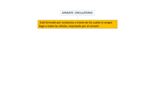 El documento describe el aparato circulatorio, incluyendo que está formado por conductos que transportan la sangre impulsada por el corazón a todas las células, llevando nutrientes y oxígeno y removiendo desechos. Explica que los sistemas circulatorios pueden ser abiertos o cerrados, y cerrados simples o dobles, dependiendo del tipo de animal.