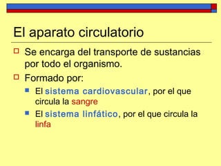 El documento trata sobre la anatomía y fisiología del aparato circulatorio. Explica que está formado por el sistema cardiovascular, por el que circula la sangre, y el sistema linfático, por el que circula la linfa. Describe la estructura del corazón, los vasos sanguíneos y el funcionamiento de la circulación sanguínea y linfática en el organismo.