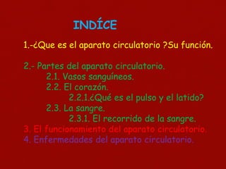 El documento describe el sistema circulatorio, incluyendo su función de transportar oxígeno y nutrientes por el cuerpo, sus partes principales como los vasos sanguíneos, el corazón y la sangre, y cómo funciona a través del recorrido de la sangre. También cubre enfermedades comunes del sistema circulatorio como la hipertensión arterial, la arteriosclerosis y los infartos.