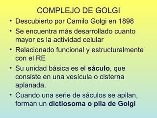 El Complejo de Golgi es un organelo celular descubierto en 1898 que se encarga de procesar y empaquetar moléculas como proteínas y lípidos. Está compuesto por una serie de cisternas apiladas llamadas dictiosomas. Cada cisterna tiene enzimas diferentes y procesa las moléculas de manera secuencial a medida que atraviesan el Complejo de Golgi. Finalmente, las moléculas son empaquetadas en vesículas cubiertas que las transportan a su destino dentro o fuera de la célula.