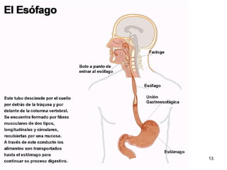 El aparato digestivo es un largo tubo que se extiende desde la boca hasta el ano. Su función es transformar los alimentos complejos en sustancias más simples que el cuerpo puede utilizar. En la boca, los dientes trituran los alimentos y las glándulas salivales los humedecen. Luego pasan al esófago y al estómago, donde son descompuestos por los jugos gástricos. Después pasan al intestino delgado, donde son digeridos por jugos del páncreas e hígado y absorbidos por