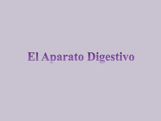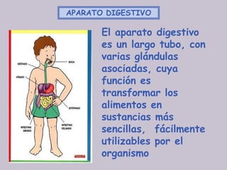 El documento resume las partes y funciones del aparato digestivo humano. El aparato digestivo está compuesto por la boca, esófago, estómago, intestino delgado, intestino grueso, hígado y páncreas. Las glándulas salivares, el hígado y el páncreas segregan sustancias que ayudan a digerir los alimentos a medida que pasan por el tracto digestivo. La digestión convierte los alimentos en nutrientes que el cuerpo puede absorber y utilizar.