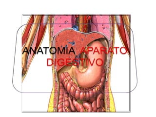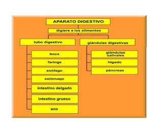 El documento resume la estructura y función del aparato digestivo humano. Se describe que el aparato digestivo es un largo tubo que se extiende desde la boca hasta el recto, dividiéndose en partes alta y baja. Las principales estructuras incluyen la boca, esófago, estómago, hígado, páncreas, intestino delgado e intestino grueso. Estas estructuras cumplen funciones como la digestión mecánica y química de los alimentos, la absorción de nutrientes y la elim