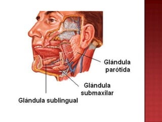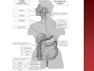 El documento describe las funciones del sistema digestivo, incluyendo los órganos del tracto gastrointestinal, las glándulas anexas y las etapas de la digestión y absorción. También cubre las características anatómicas y funcionales de los órganos digestivos principales como la boca, esófago, estómago e intestinos, así como enfermedades comunes como la úlcera péptica y apendicitis.