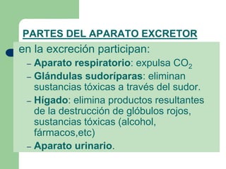 El documento describe el sistema excretor humano. Explica que los órganos excretores incluyen los pulmones, hígado, glándulas sudoríparas y el aparato urinario. Se enfoca en el aparato urinario, describiendo sus partes como los riñones, vías urinarias, vejiga y uretra. Describe las funciones de los riñones, incluyendo la formación de la orina a través de la filtración, reabsorción y secreción en las nefronas. También menciona algunos trastorn