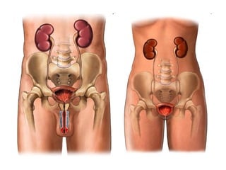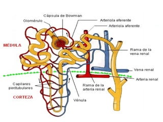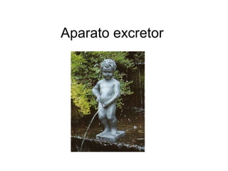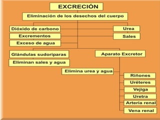 El documento describe el aparato excretor y sus sistemas colaboradores. Los riñones filtran la sangre para producir la orina, que pasa por los uréteres a la vejiga y luego sale a través de la uretra. El sudor también ayuda a la excreción a través de las glándulas sudoríparas. Las enfermedades del aparato excretor incluyen cálculos renales, infecciones del tracto urinario e insuficiencia renal.