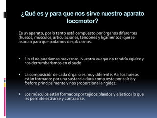El aparato locomotor está compuesto por huesos, músculos, articulaciones, tendones y ligamentos que se asocian para permitir el movimiento del cuerpo. Los huesos proporcionan rigidez y estructura, los músculos se contraen para mover los huesos a través de las articulaciones, y los tendones y ligamentos conectan los músculos y huesos para permitir el movimiento y mantener la estabilidad de las articulaciones. Juntos, estos órganos permiten que el cuerpo se mueva y se desplace