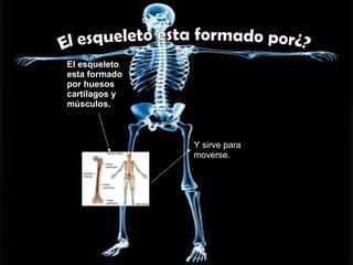 El esqueleto está formado por huesos, cartílagos y músculos y sirve para mover el cuerpo. Puede sufrir lesiones como fracturas, distensiones o luxaciones. Su función principal es sostener y dar forma al cuerpo además de proteger órganos vitales. Existen diferentes tipos de articulaciones como las fijas, móviles y semimóviles, unidas por tendones.