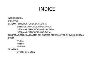 Este documento presenta información sobre el sistema reproductor de las hembras bovinas, porcinas y ovinas. Describe las partes principales de cada sistema reproductor, incluyendo la vulva, útero y ovarios. Explica las diferencias en la forma y tamaño del útero y ovarios entre las especies. También compara las características de los ovarios bovinos y ovinos. Por último, muestra imágenes que ilustran las diferencias entre cesáreas tempranas y tardías en vacas.