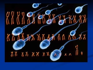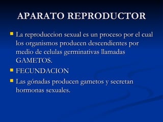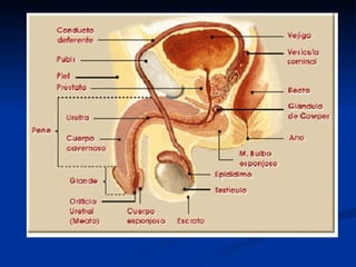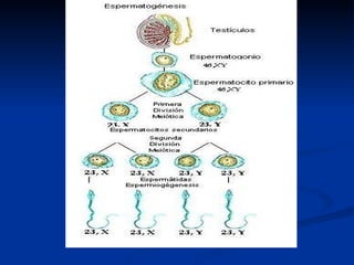 El documento describe el aparato reproductor masculino. Explica que los testículos producen espermatozoides a través de la espermatogénesis y que varios conductos transportan los espermatozoides, incluyendo el epidídimo, conducto deferente y conducto eyaculador. También describe las glándulas sexuales auxiliares como las vesículas seminales y la próstata, que secretan fluidos para nutrir y transportar los espermatozoides.