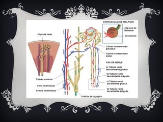 El documento proporciona información sobre el aparato respiratorio y el sistema renal. Describe las partes principales del aparato respiratorio como la nariz, la tráquea, los pulmones y los alvéolos, y explica brevemente su función. También describe las partes del sistema renal como los riñones, los uréteres y la vejiga, y sus funciones de filtrar la sangre y producir orina.