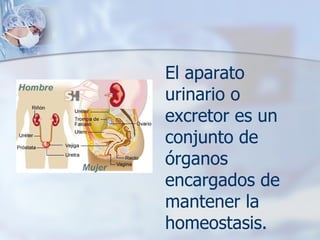 El documento describe el aparato urinario. Los riñones filtran la sangre y producen la orina, que pasa por los ureteres a la vejiga. La vejiga almacena orina temporalmente hasta la micción, cuando se vacía a través de la uretra. La uretra en los hombres es más larga que en las mujeres y pasa por la próstata y pene. El proceso de micción implica músculos y nervios que controlan la vejiga y esfínteres.