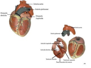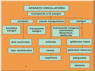 El documento describe el sistema circulatorio y sus componentes principales. Explica que la sangre fluye a través del corazón y los vasos sanguíneos, recogiendo oxígeno de los pulmones y nutrientes del intestino para distribuirlos a las células, y luego retirando los desechos y dióxido de carbono. Describe que el corazón bombea la sangre a través de dos circuitos, la circulación pulmonar y la circulación sistémica, para oxigenar la sangre y distribuirla por todo el cuerpo.