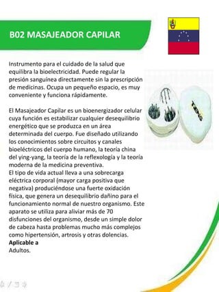 El documento presenta un catálogo de productos de la línea de aparatos de la compañía TIENS para el año 2009, incluyendo masajeadores capilares, fajas reductoras simples y de lujo, máscaras de rejuvenecimiento inteligentes y varios tipos de almohadas taoístas con diferentes funciones terapéuticas. El distribuidor independiente Dario Estrada ofrece información sobre cómo adquirir estos productos ya sea como cliente, prosumidor o distribuidor.