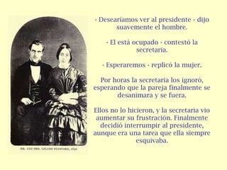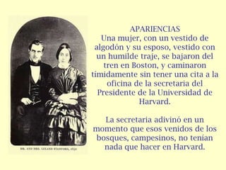 La pareja Leland Stanford y su esposa visitaron la oficina del presidente de Harvard para donar un edificio en memoria de su hijo fallecido, pero la secretaria y el presidente los subestimaron por su apariencia humilde. Cuando el presidente se burló del costo de su donación, la pareja decidió establecer su propia universidad, la Universidad Stanford, la cual hoy en día es considerada mejor que Harvard.