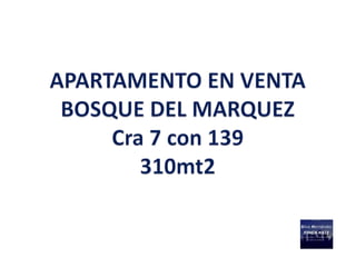 Este documento describe un apartamento de 310 metros cuadrados en el Bosque del Marquez. El apartamento tiene 3 habitaciones con baño privado, un baño social, un estudio, una biblioteca y 3 garajes. Se encuentra en estrato 6 y tiene acceso a un club house y zonas verdes. El precio de venta es de $1.400.000.000 con una administración mensual de $1.200.000.
