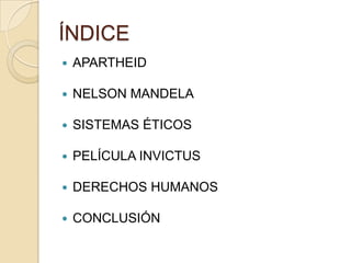 El documento proporciona una introducción al apartheid en Sudáfrica. Explica que el apartheid fue una política de segregación racial y organización territorial aplicada desde 1944, que separaba a la población en grupos raciales y jerarquizaba a los blancos por encima de los otros. También describe la historia del apartheid, su organización a través de la creación de "homelands" y leyes raciales, y la resistencia de grupos y líderes anti-apartheid como Nelson Mandela y el Congreso Nacional Africano.
