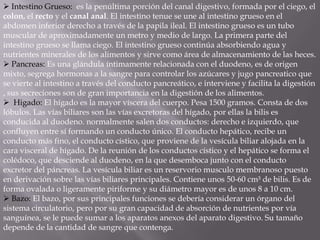 El aparato digestivo está compuesto por una serie de órganos como la boca, faringe, esófago, estómago, intestino delgado e intestino grueso, que se encargan de digerir los alimentos para que puedan ser absorbidos por el cuerpo. Otros órganos como el páncreas, hígado y bazo también forman parte del sistema digestivo y ayudan en la digestión secretando enzimas e interviniendo en la absorción de nutrientes.