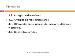 Este documento describe los arreglos unidimensionales y multidimensionales, así como los tipos estructurados. Explica que los arreglos son colecciones de datos del mismo tipo almacenados de forma ordenada y que pueden ser de una, dos o más dimensiones. También cubre temas como la inicialización, acceso y actualización de elementos de arreglos utilizando índices, y la diferencia entre datos estructurados estáticos y dinámicos.