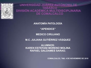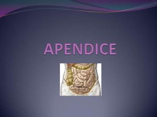 Este documento describe la anatomía y patología del apéndice. Explica que la apendicitis es la inflamación del apéndice causada principalmente por la obstrucción de su luz, lo que conduce a isquemia, necrosis y posible perforación. Detalla los síntomas, el diagnóstico y el tratamiento de la apendicitis aguda a través de la apendicectomía quirúrgica. También menciona otros tumores menos comunes que pueden afectar el apéndice.