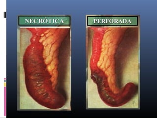 La apendicitis es la primera causa de abdomen agudo no traumático. Se describe su historia, anatomía, etiología, síntomas, signos, pruebas de laboratorio e imágenes de diagnóstico. Las técnicas quirúrgicas para su tratamiento incluyen la incisión de Rockey-Davis y la sutura del muñón apendicular.
