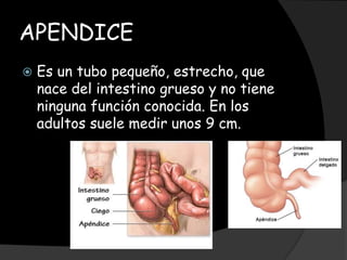 El apéndice es un órgano pequeño sin función conocida que puede inflamarse, causando apendicitis. La apendicitis ocurre cuando el orificio del apéndice se obstruye, causando infección e inflamación. Los síntomas incluyen dolor abdominal y fiebre. El tratamiento involucra antibióticos e hidratación, y cirugía (apendicectomía) para extraer el apéndice inflamado.