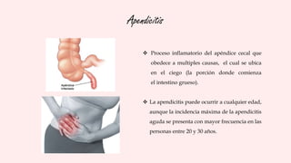 Este documento resume la anatomía, fisiopatología y tratamiento de la apendicitis aguda. La apendicitis es una inflamación del apéndice cecal que generalmente se debe a la obstrucción de su luz y puede ocurrir a cualquier edad, aunque es más común entre los 20 y 30 años. El dolor abdominal agudo es el síntoma principal. El tratamiento consiste en la administración de antibióticos y la remoción quirúrgica del apéndice inflamado (apendicectomía) para prevenir complicaciones como el absceso