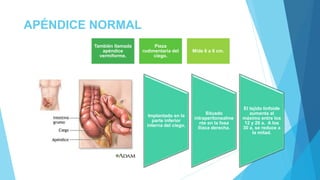 La apendicitis aguda es la inflamación del apéndice vermiforme, una de las enfermedades más comunes que provocan síndrome de abdomen agudo quirúrgico. Se produce por la obstrucción del apéndice, lo que causa dolor abdominal, náuseas y fiebre. Existen dos métodos para tratar la apendicitis aguda: la apendicectomía abierta a través de una incisión en el abdomen, y la apendicectomía laparoscópica mediante trocares. Ambas cirugías requieren