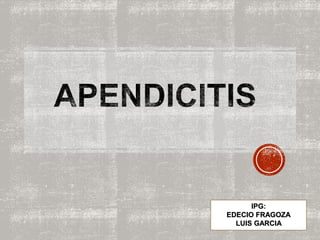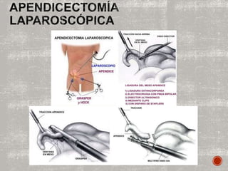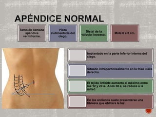El documento describe la anatomía, fisiopatología, manifestaciones clínicas, diagnóstico y tratamiento de la apendicitis aguda. Específicamente, se detalla que la apendicitis aguda es una inflamación del apéndice vermiforme que requiere tratamiento quirúrgico urgente, y que sus causas más comunes son la obstrucción luminal del apéndice.