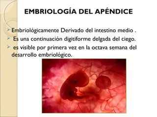 La apendicitis aguda es una inflamación del apéndice cecal. Se presenta con más frecuencia entre los 10 y 30 años y es más común en hombres. Los síntomas incluyen dolor abdominal que migra al cuadrante inferior derecho, náuseas, vómitos y fiebre. El diagnóstico se basa en el examen físico, estudios de laboratorio como recuento de glóbulos blancos y la ecografía o TAC. El tratamiento es quirúrgico mediante apendicectomía convencional o laparosc