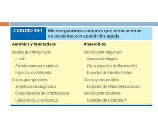 El documento aborda la apendicitis, incluyendo su historia, definición, anatomía, epidemiología, etiología y fisiopatología. Se destacan los síntomas, signos clínicos, métodos diagnósticos y el manejo preoperatorio, enfatizando la apendicectomía como tratamiento principal. También se mencionan las complicaciones asociadas y factores que influyen en la mortalidad.