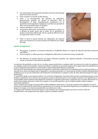 La apendicitis es la inflamación del apéndice, una estructura anexa al intestino grueso. Los síntomas típicos incluyen dolor en la parte baja derecha del abdomen que progresa desde el estómago, fiebre leve y dolor agudo en un punto específico. El diagnóstico se basa en los síntomas y exámenes de laboratorio y radiografías pueden ayudar a confirmarlo. El tratamiento requiere cirugía para extirpar el apéndice de forma laparoscópica o abiert