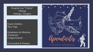 Este documento resume la anatomía, etiología, fisiopatología, manifestaciones clínicas, diagnóstico y tratamiento de la apendicitis aguda. La apendicitis es la inflamación del apéndice vermiforme y es causada comúnmente por la obstrucción del lumen apendicular. Los síntomas clásicos incluyen dolor en la fosa ilíaca derecha, náuseas y vómitos. El diagnóstico se basa en el examen físico, puntuación de Alvarado y tomografía computarizada