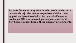 La paciente femenina de 15 años presentó dolor abdominal que luego se convirtió en dolor epigástrico tipo cólico de dos días de evolución. Los exámenes mostraron leucocitos elevados y ultrasonido reveló líquido abdominal. Durante la cirugía exploratoria, se encontró un apéndice perforado y gangrenado, por lo que se realizó una apendicectomía. El diagnóstico final fue apendicitis aguda complicada.