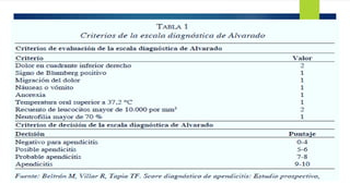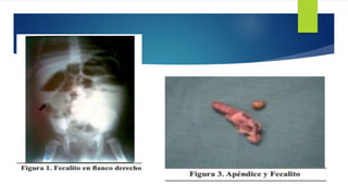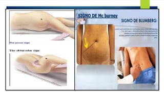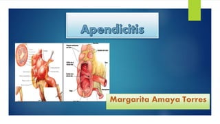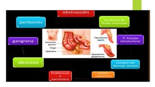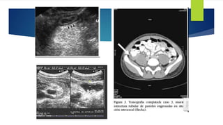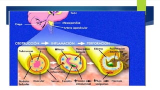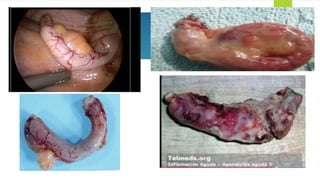 La apendicitis aguda es la inflamación del apéndice cecal causada por la obstrucción de su luz, lo que aumenta la presión intraluminal. Los síntomas incluyen dolor abdominal intenso localizado en la fosa iliaca derecha, náuseas, vómitos y fiebre. El diagnóstico se basa en la exploración física y pruebas de imagen como la ecografía o TAC abdominal. El tratamiento es la apendicectomía quirúrgica o antibióticos para casos leves no complicados.
